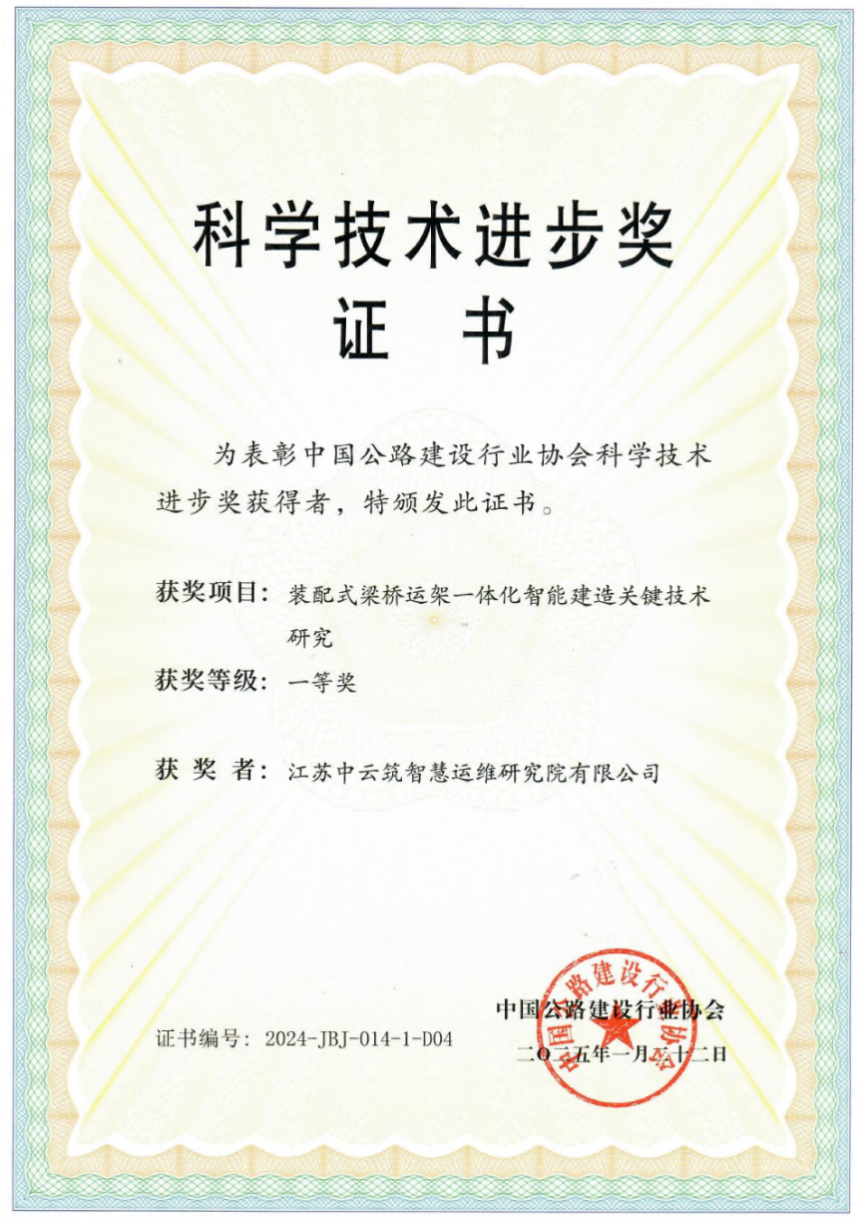 近日,中国公路建设行业协会正式公布 2024 年度科学技术进步奖评选结果,江苏中云筑智慧运维研究院有限公司(以下简称 “江苏中云筑”)作为核心参与方,联合东南大学、湘潭大学、江苏东部高速公路管理有限公司共同完成的 “装配式梁桥运架一体化智能建造关键技术研究” 项目,凭借在公路桥梁建造领域的技术突破,成功斩获一等奖,证书编号为 2024-JBJ-014-1-D04(江苏中云筑)。